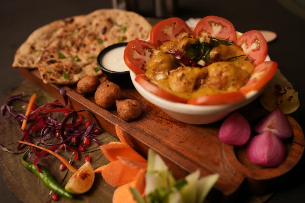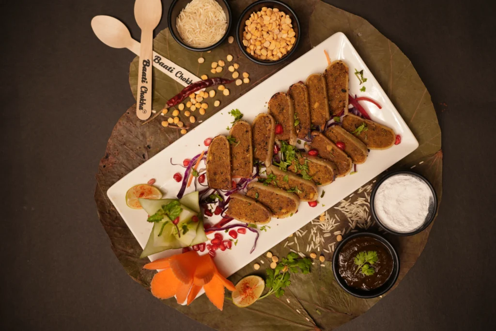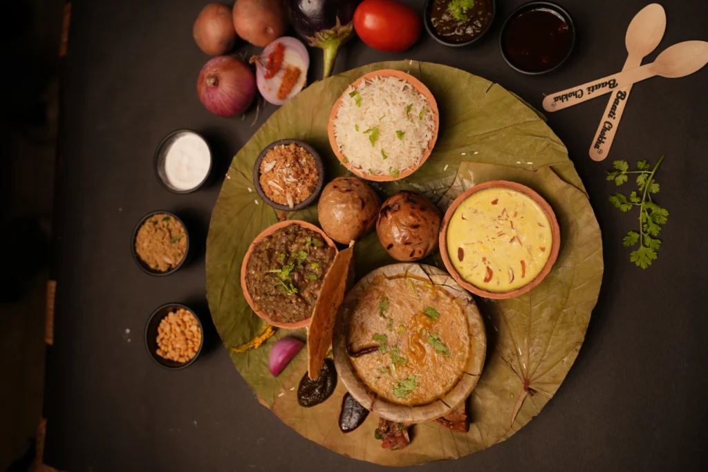 2 pcs (Choose any: Paneer Baati / Sattu Baati), Chokha, Dal, Chawal, Chatani, Achar, Pyaj, Mix Salad, Kheer or Balhir, Churma, Papad