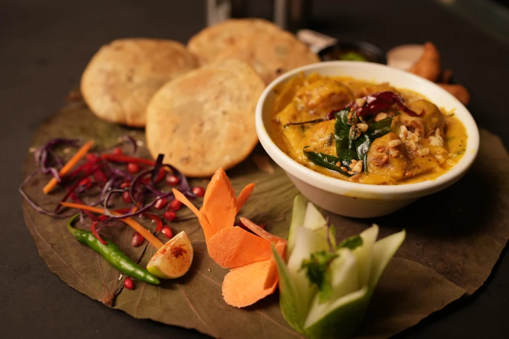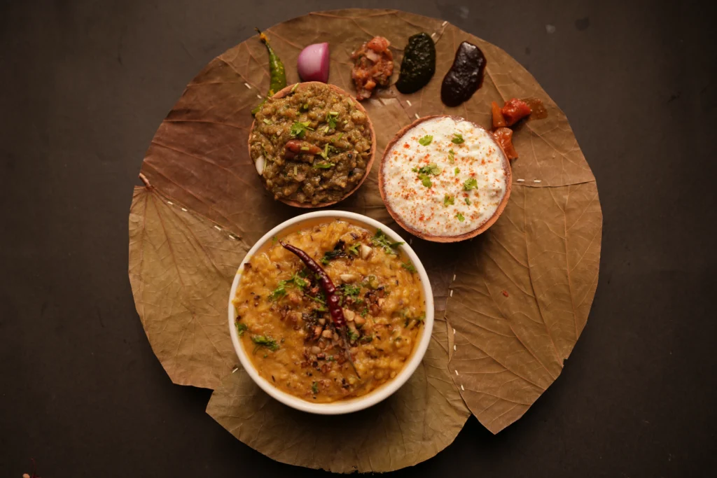 Dal, Chawal, Chokha, Papad, Chatani, Achar, Pyaj, Mix Salad