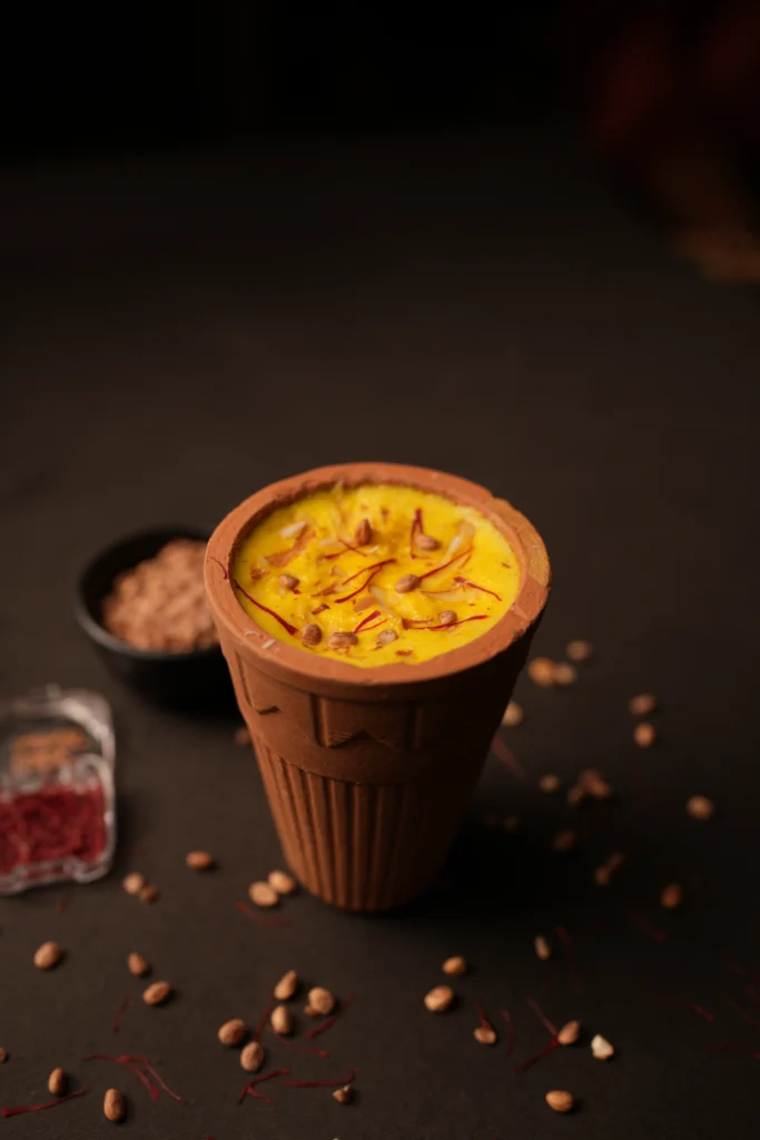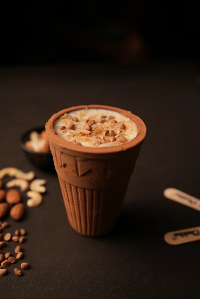 Slow-cooked rice pudding served in a traditional clay cup, rich with milk, cardamom, and a subtle earthy aroma.