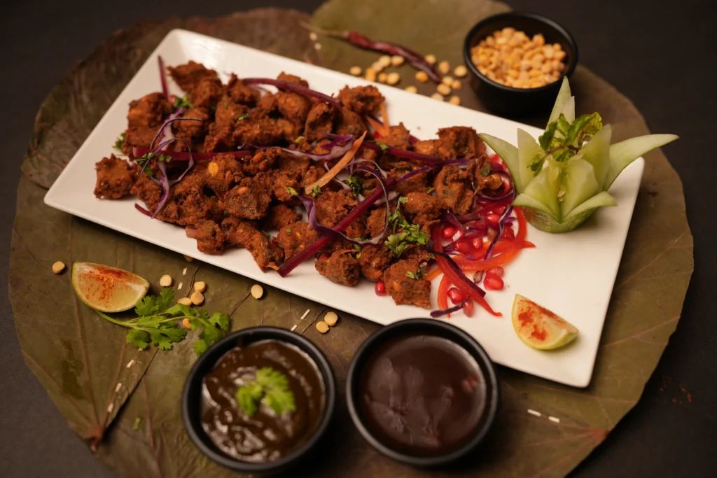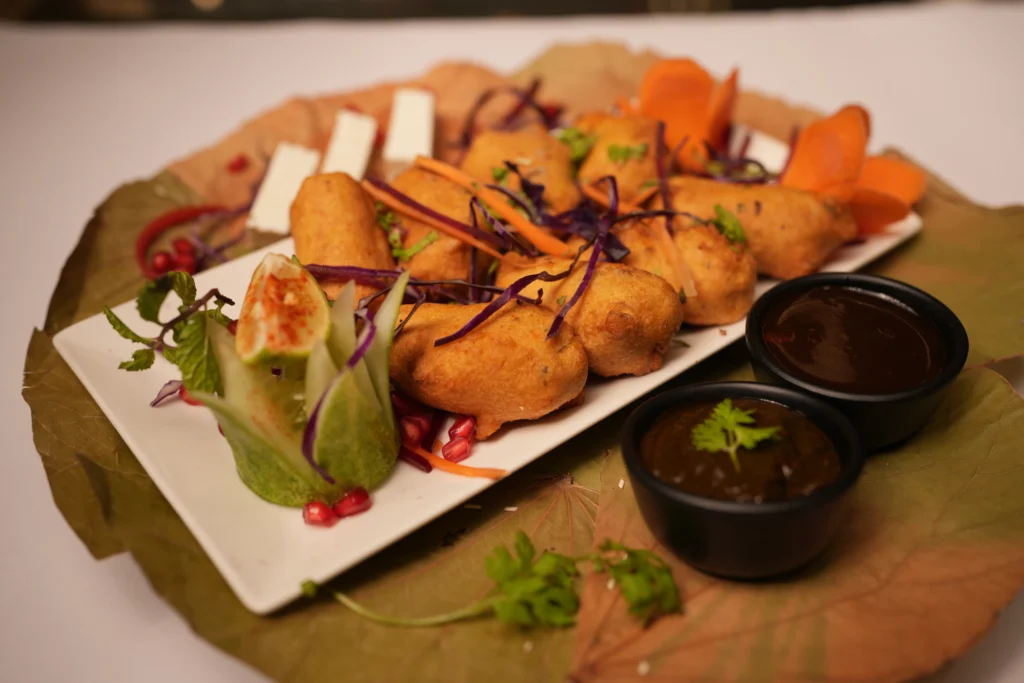 2 pcs (Choose any: Sattu Baati / Plain Baati), Chokha, Dal, Chawal, Papad, Chatani, Pyaj, Mix Salad, Churma